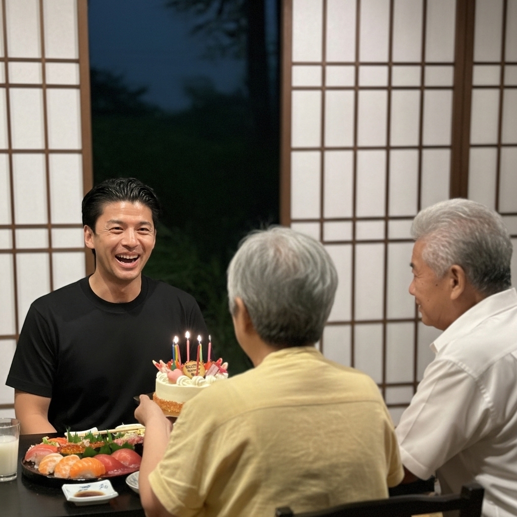ケーキにはロウソクが立っていて、「ハッピーバースデ~♪」と両親の歌声が。